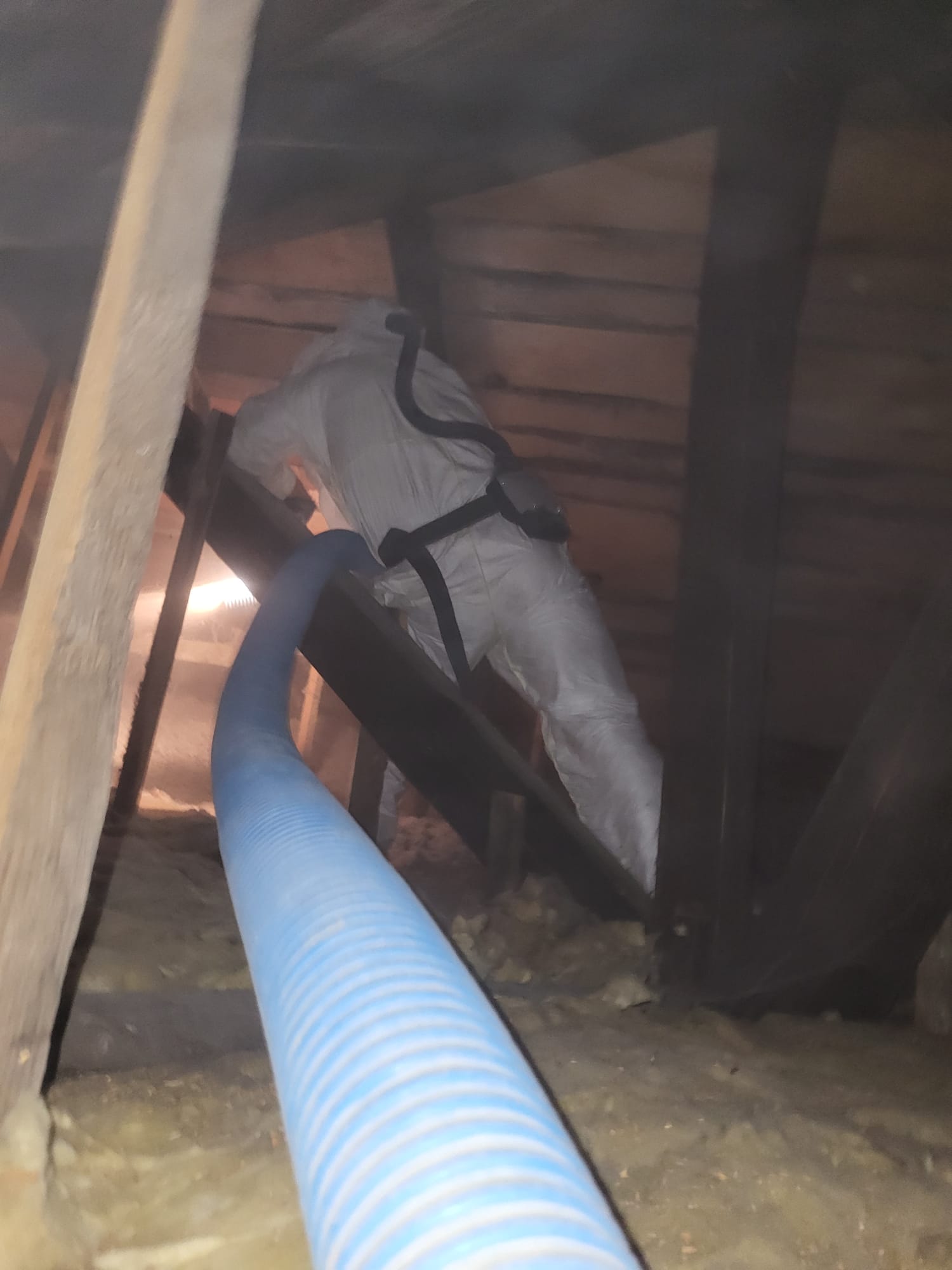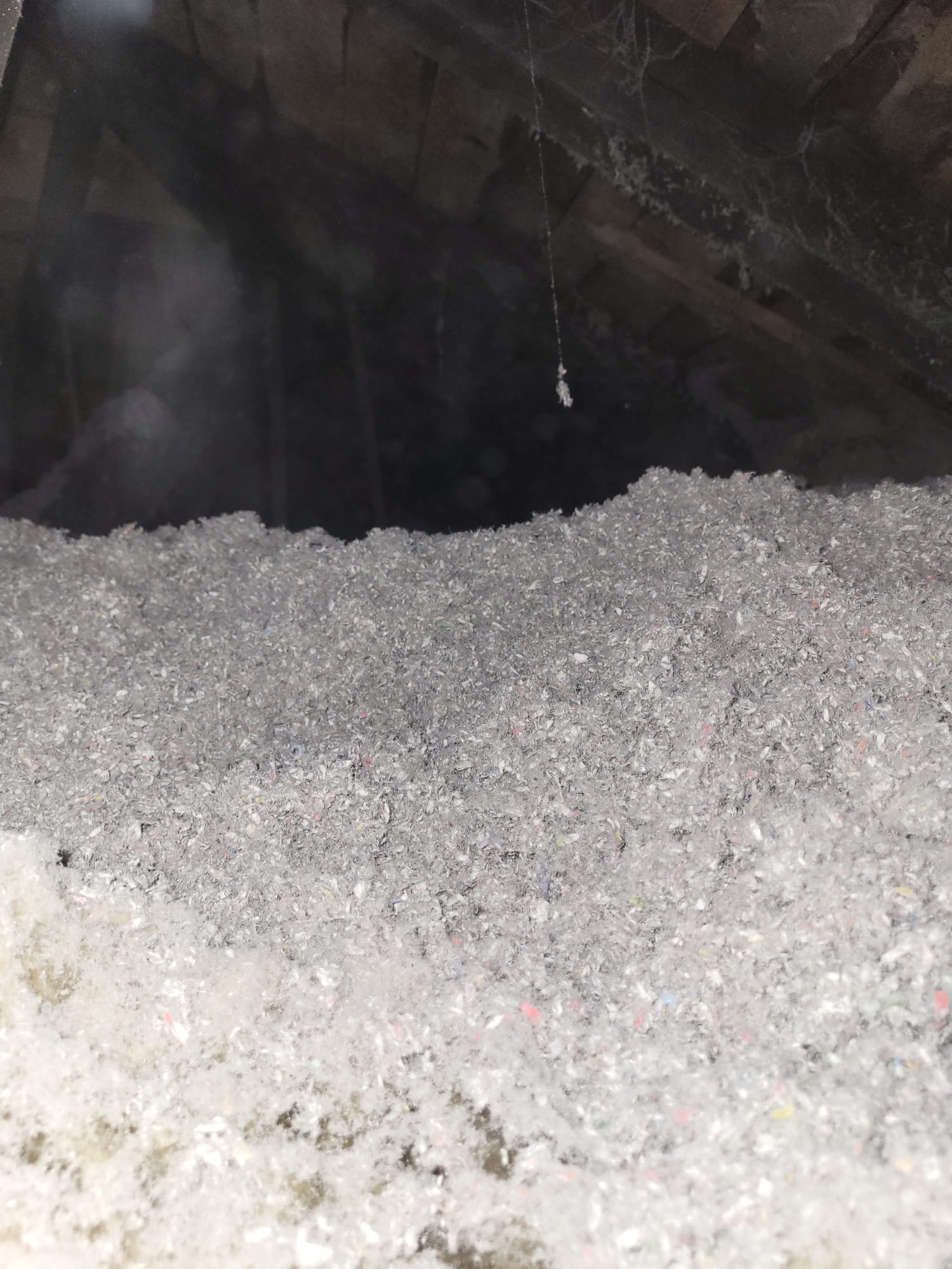 Po audycie technicznym zaproponowaliśmy ocieplenie stropu metodą wdmuchiwania celulozy — technologię idealnie dopasowującą się do nieregularnych przestrzeni i szczelin.