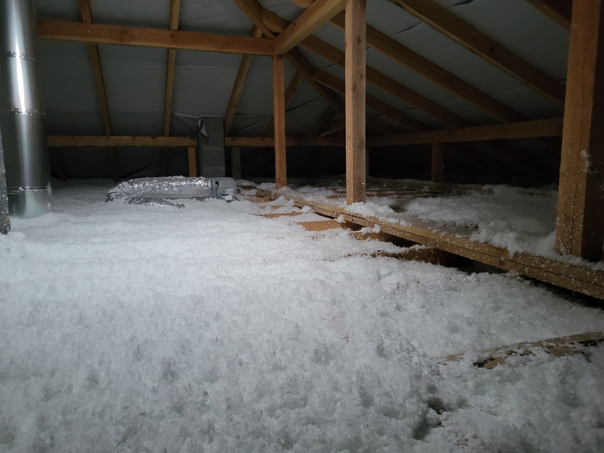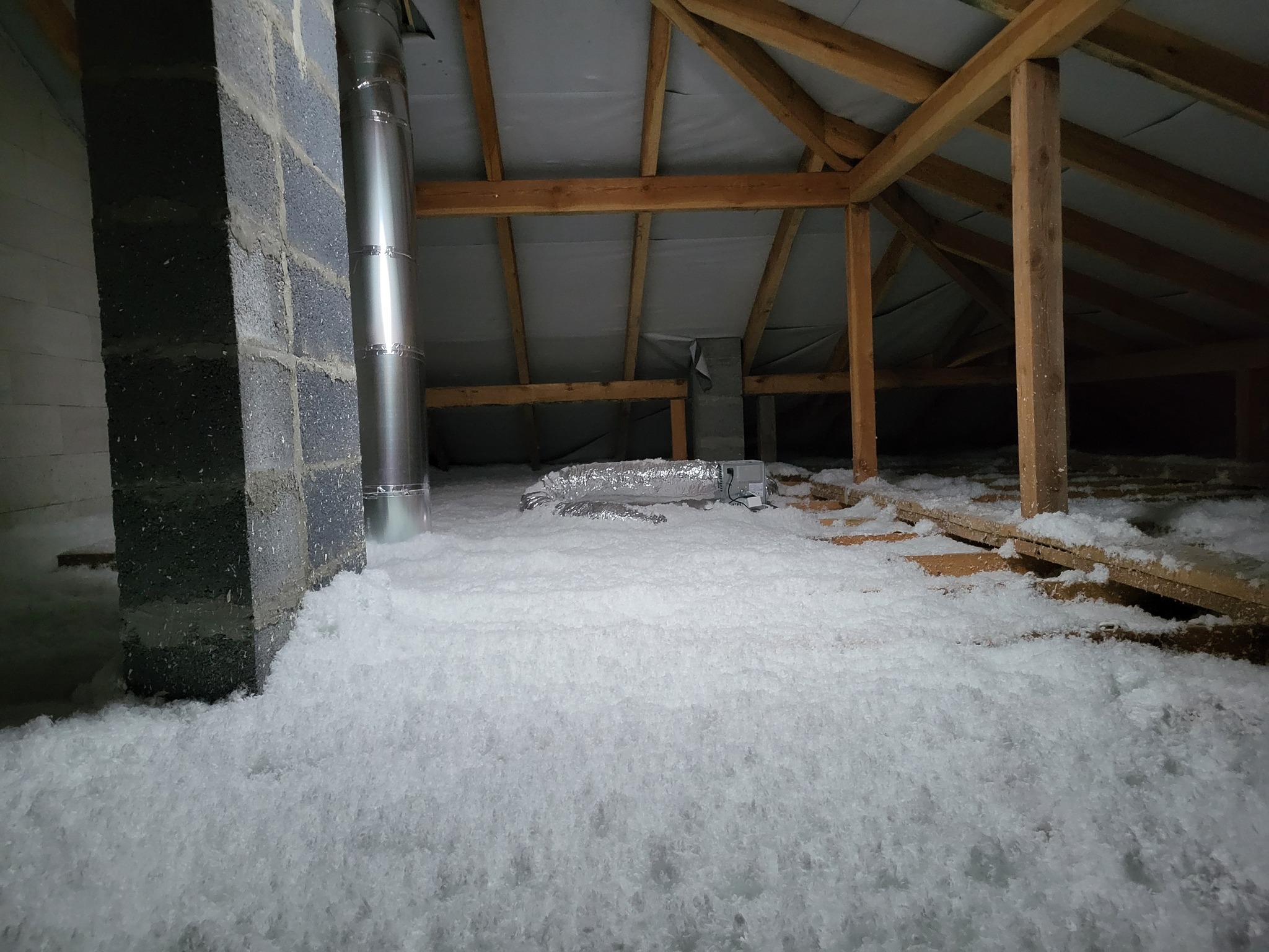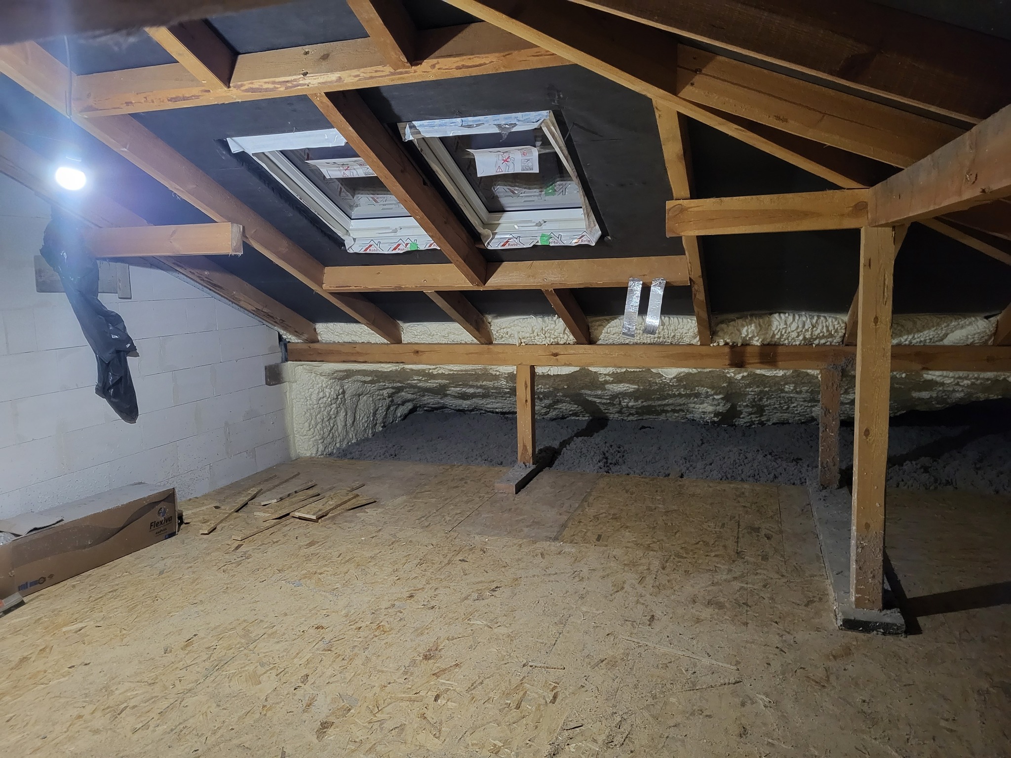 - pianę poliuretanową (piana PUR) — docelowa grubość warstwy: 25 cm. Natrysk zapewnił szczelność i zredukował mostki termiczne.
